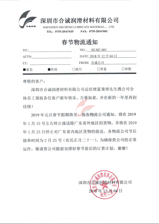 深圳市合誠潤滑材料有限公司總經(jīng)理藍(lán)秉理先生攜公司全體員工預(yù)祝各位客戶新年快樂、萬事如意,并在新的一年里再創(chuàng)佳績!